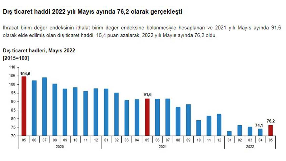 İhracat birim değer endeksinin ithalat birim değer endeksine bölünmesiyle hesaplanan ve Mayıs 2021’de 91,6 olarak elde edilmiş olan dış ticaret haddi, 15,4 puan azalarak, Mayıs 2022’de 76,2 oldu.