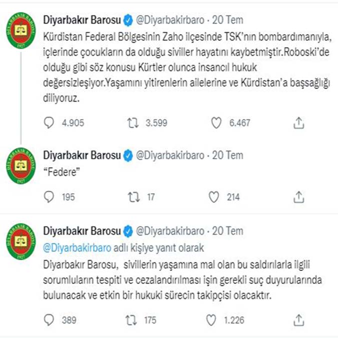 Diyarbakır Cumhuriyet Başsavcılığı tarafından, Irak’ın Zaho kentinde sivillere yönelik saldırıyla ilgili Diyarbakır Barosu’nun, Türk Silahlı Kuvvetleri’ni (TSK) sorumlu tuttuğu paylaşım nedeniyle inceleme başlatıldı.