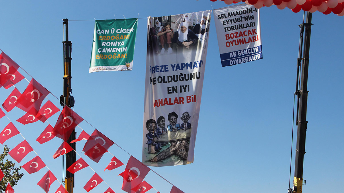 Alanda asılan pankartları okuyan Cumhurbaşkanı Erdoğan, ”Bir pankart daha var; ‘Diyarbakır etrafında Bağlar var. Altılı masa size buradan mesaj var. Sahiplerinize fırsat vermeyeceğiz. Kürtleri masanıza meze etmeyeceğiz’ Biz yıllardır ne diyoruz; Biz Türk’üyle, Kürt’üyle, Laz’ıyla, Çerkez’iyle, Abhaza’sıyla ne diyoruz; Yaradılanı yaradan da ötürü severiz.