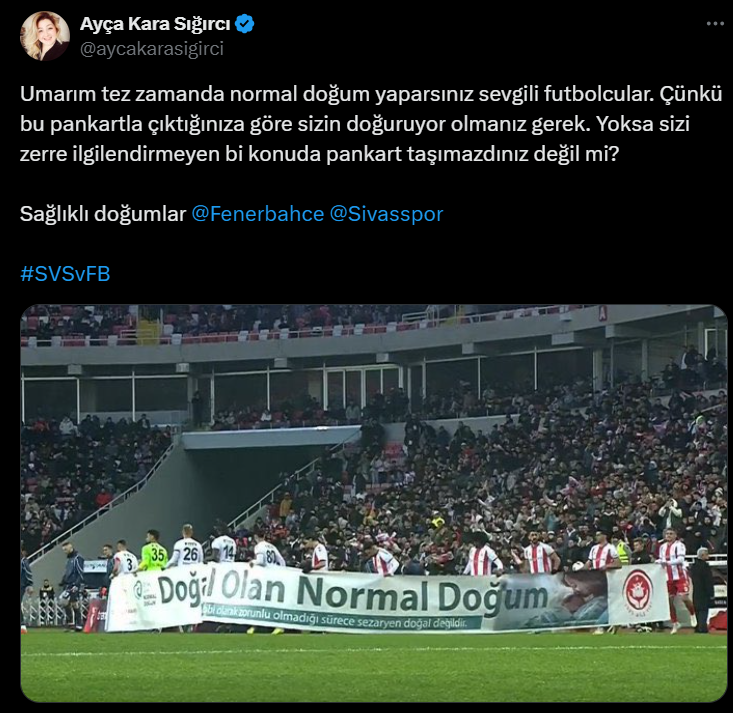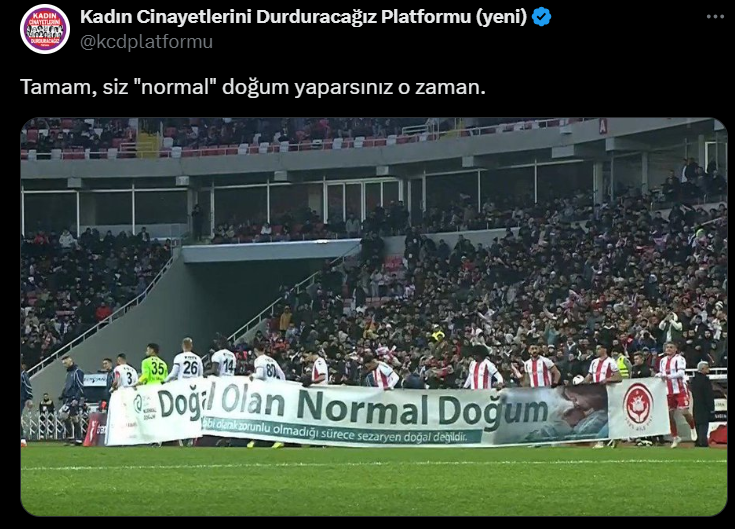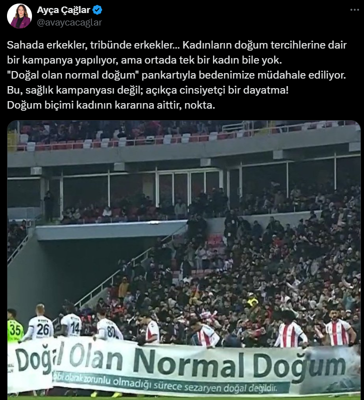 “Futbol sahasında 11 erkeğin ‘doğal olan normal doğumdur’ pankartıyla çıkması, AKP iktidarının kadınların bedenine, doğurganlığına ve yaşam tercihlerine yönelik sistematik baskısının yeni bir örneğidir. Futbol sahaları kadın bedeninin propaganda malzemesi yapılacağı alanlar değildir. Devletin ya da herhangi bir erkeğin, kadınlara nasıl doğuracaklarını dikte etme ne hakkıdır ne de haddidir.”