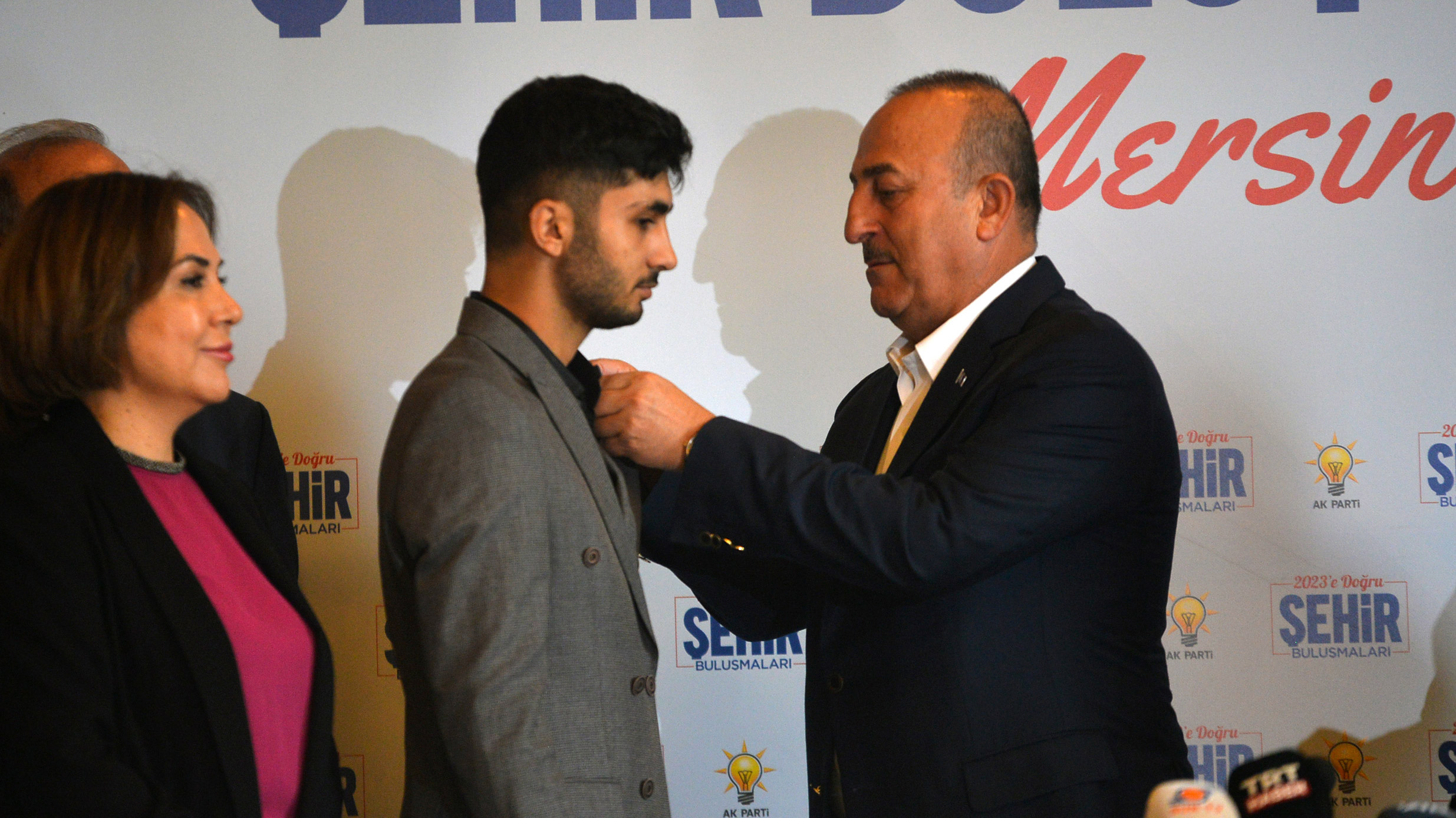 Çavuşoğlu, daha sonra partiye katılanlara rozet taktı.