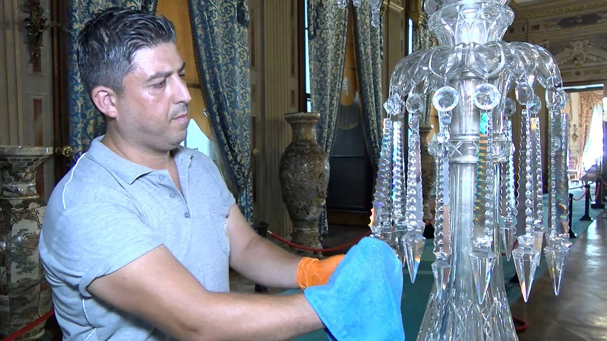 Turistler yürürken titreşimden oluşan tınılarıyla, kristal sesleriyle hakikaten büyülü bir atmosfer oluştururlar. Çalışmakta olan ekibimiz bütün kristal avize ve şamdanların hem yüzey temizliğini yaparlar ama bunu yapmak için de tek tek sökerler. Bu çok kolay bir şey değil. Hepsinin söktüğünüz yere takmak zorundasınız çünkü bunların hepsi el işçiliğidir. Bir kolun dibi diğer kolun dibinden daha farklı olabilir. Onun için hepsini yerine geri takmamız gerekir” diye konuştu.