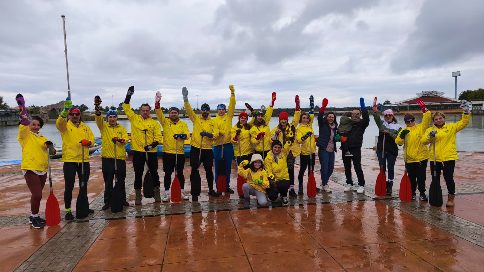 Takım sporcuları, etkinlik çerçevesinde antrenman sırasında renkli çorapları ellerine geçirerek kürek çekti.