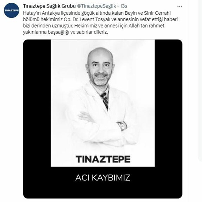 İzmir Tınaztepe Üniversitesi Özel Buca Hastanesi’nin sosyal medya hesabından yapılan açıklamada, “Hatay’ın Antakya ilçesinde göçük altında kalan Beyin ve Sinir Cerrahi bölümü hekimimiz Op. Dr. Levent Tosyalı ve annesinin vefat ettiği haberi bizi derinden üzmüştür. Hekimimiz ve annesi için Allah’tan rahmet yakınlarına başsağlığı ve sabırlar dileriz” denildi.