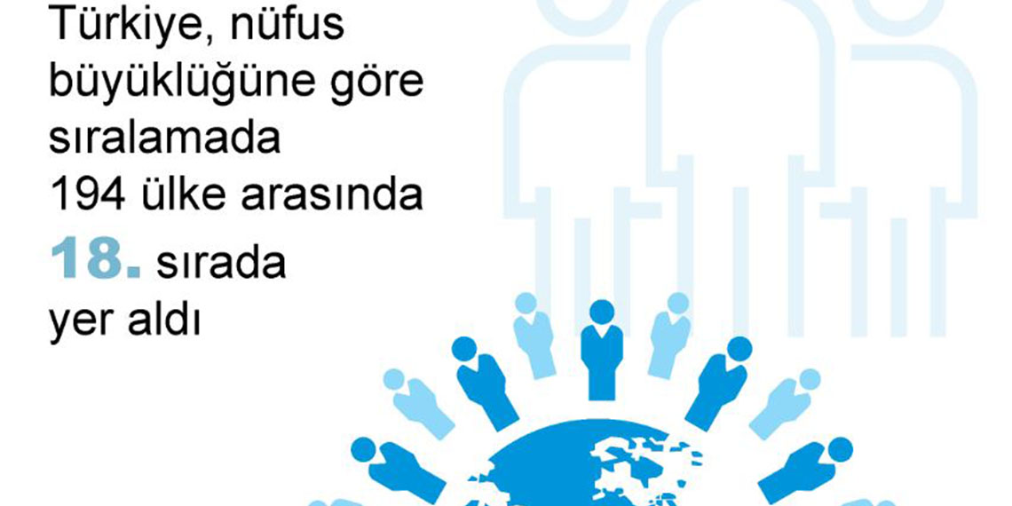 Türkiye İstatistik Kurumu (TÜİK), Türkiye’nin 85 milyon 372 bin 377 nüfusu ile nüfus büyüklüğüne göre 194 ülke arasında 18’inci sırada yer alırken; Dünya nüfusunun yüzde 1.1’ini Türk vatandaşının oluşturduğunu açıkladı.