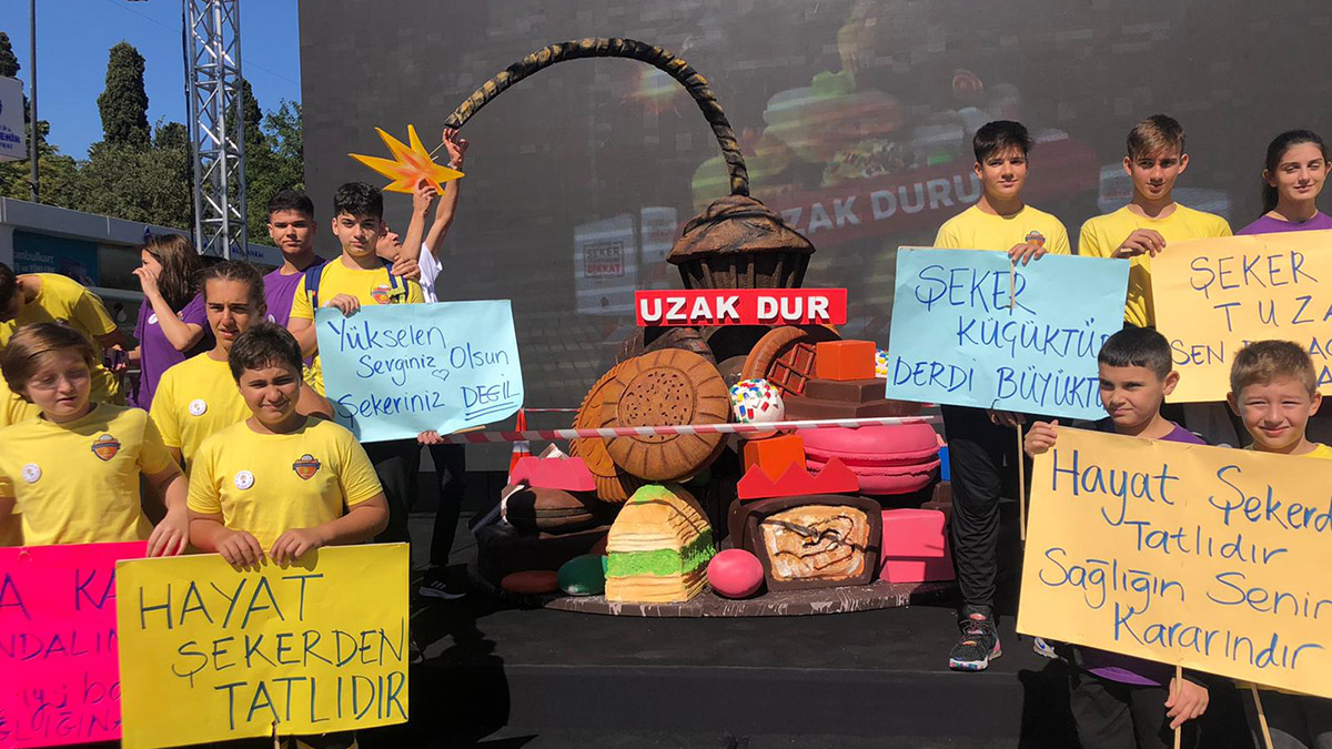 Türk Böbrek Vakfı’nın hayata geçirdiği, ‘Dünya Şeker Tüketimine Dikkat Haftası’ kapsamında Şişli meydanında üzerinde bomba süsü olan dev şeker maketi ile şeker tüketimine dikkat çekildi.