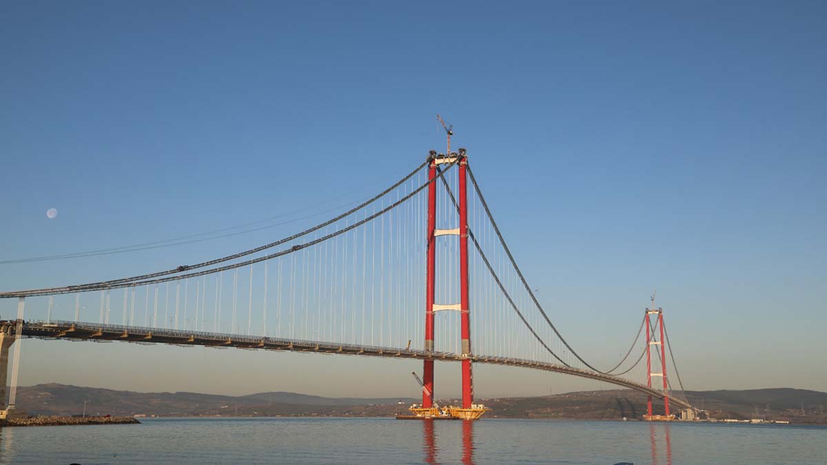 “4 bin 600 metre gibi çok çok uzun bir köprü. 2 bin 23 metre iki ayak aralığıyla Cumhuriyetimizin 100’üncü yılına atıfla, 318 metre ayak yüksekliğiyle 18 Mart’a atıfla hazırlanan bir köprü. 162 bin kilometre tel kullanıldı. Yani dünyayı 4 defa saracak kadar bir telden bahsediyoruz. Devasa bir yapı. 15 ülkeden 12 bin kişi çalıştı, farklı zamanlarda. Kırmızı-beyaz betonlarıyla Türk bayrağımıza atıfla hazırlanan bir betonarme.