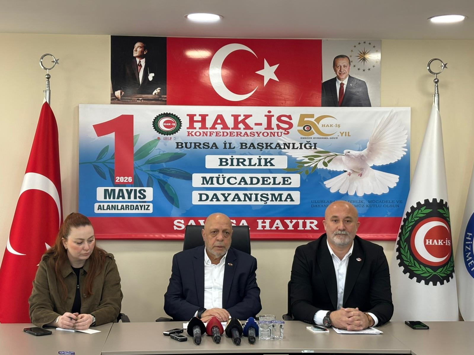 1 Mayıs etkinlikleri öncesi Bursa’ya gelen Hak-İş Genel Başkanı Mahmut Arslan, 1 Mayıs Uluslararası Birlik, Mücadele ve Dayanışma günü etkinlikleri kapsamında 'Birlik, Mücadele, Dayanışma ve Savaşa Hayır' temasıyla il başkanlığında basın toplantısı düzenledi. Toplantıda konuşan Hak-İş Genel Başkanı Mahmut Arslan, "Daha önceden Bursa’ya borcumuz vardı. Pandemiden dolayı gerçekleştirememiştik. Yönetim kurulu kararıyla 1 Mayıs etkinliklerimizi Bursa’da gerçekleştireceğiz. 1 Mayıs, uluslararası emek hareketinin en önemli günlerinden biridir. 1 Mayıs, 140 yaşında. 1886 yılında Şikago'daki tekstil işçilerinin ağır çalışma şartlarına karşı ücret verilmemesi üzerine 12 saatlik çalışma saatlerinin 8 saate inmesi konusunda bir dizi çalışmalar yapıyor. Daha sonra miting düzenliyorlar. Miting provoke ediliyor. Maalesef bazı sendikacılar idam edilirken, bazıları ömür boyu hapse atılıyor. Bir süre sonra da 1 Mayıs'ın bütün dünyada çeşitli etkinliklerle kutlanmasına karar veriliyor" dedi.