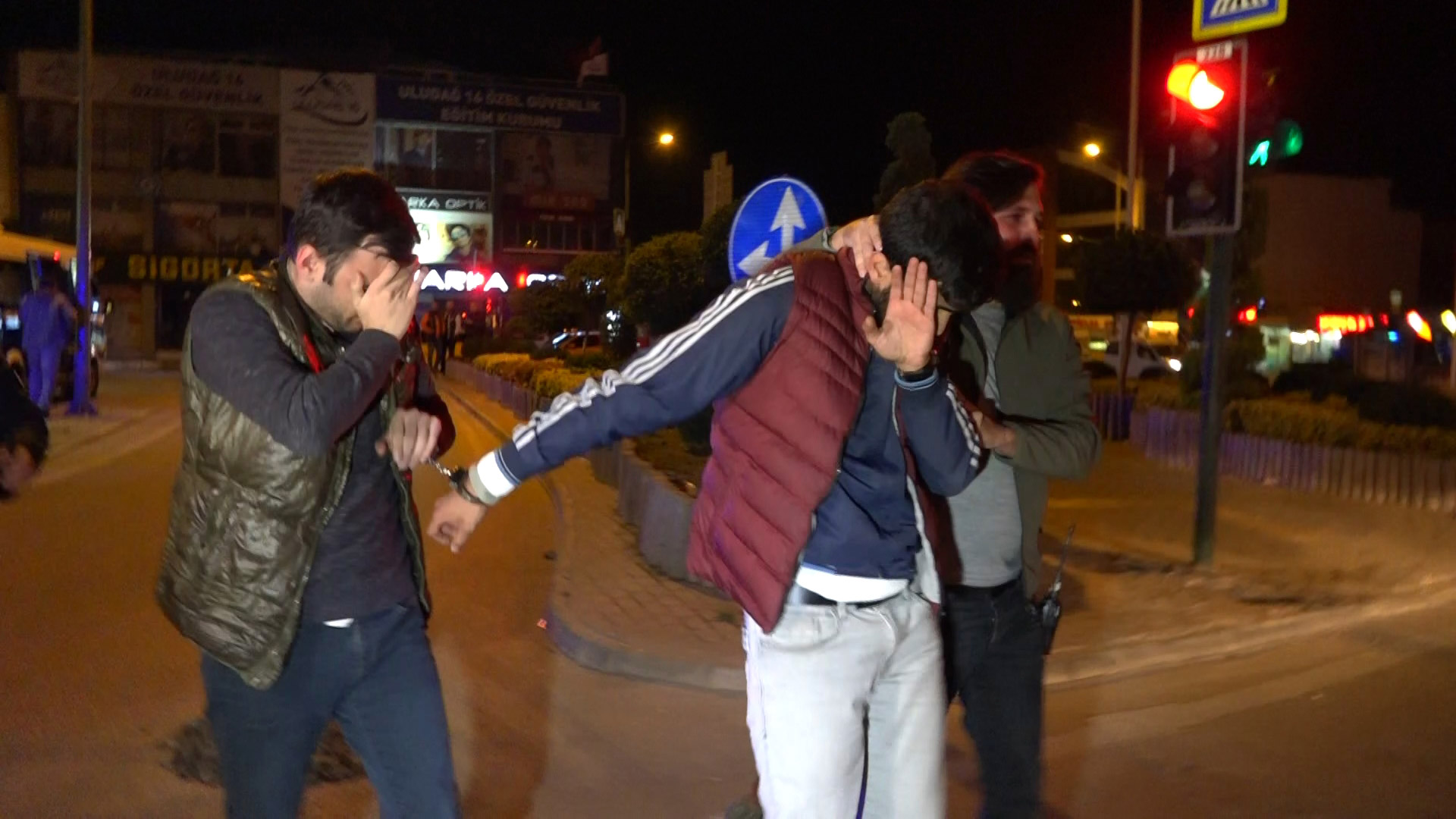 Şüpheli Ali Burak K. Ankara Yolu Caddesi’nde Yıldırım ilçesi istikametine kaçışını sürdürürken, polis ekipleri kaçış güzergahında önlem alarak Yüksek İhtisas Kavşağı’nı barikat kurarak kapattı. 10 dakika süren takibin ardından polis barikatına takılan ve araçtan inerek kaçmaya çalışan Ali Burak K. ile minibüsdeki arkadaşları Yusuf C. ve Yağız K. kıskıvrak yakalandı.