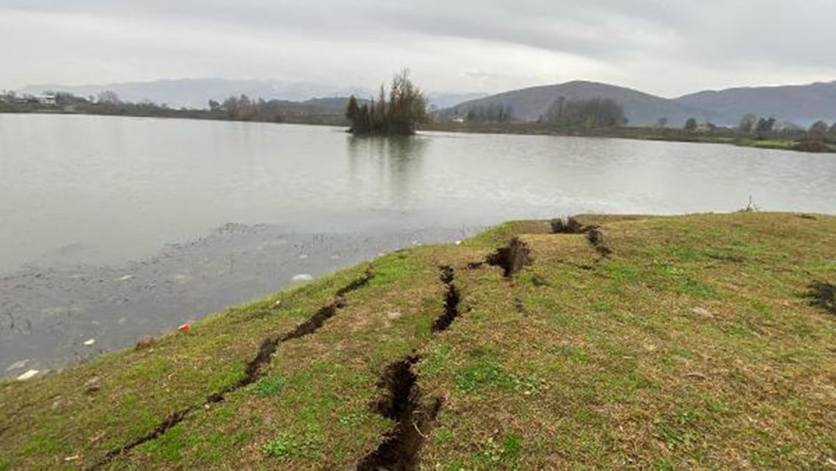 Düzce’nin Gölyaka ilçesinde, 5.9’luk depremde Büyük Melen Çayı yakınlarında göletin etrafındaki toprak alanda çatlaklar oluştuğu gözlendi.