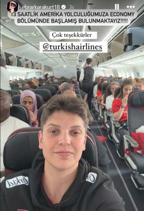 A Milli Kadın Voleybol Takım oyuncusu Ebrar Karakurt sosyal medya hesabından yaptığı paylaşımla, “13 saatlik Amerika yolculuğumuza economy bölümünde başlamış bulunmaktayız çok teşekkürler Türk Hava Yolları’na” diyerek tepki gösterdi.