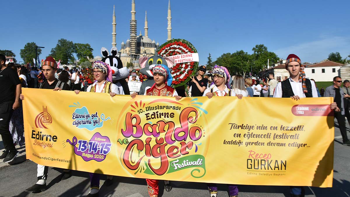 Edirne’de pandemi nedeniyle 2 yıldır yapılamayan Uluslararası Bando ve Ciğer Festivali’nin 10’uncusu start aldı. Festival kapsamında yerli ve yabancı bando ekipleriyle, ciğerci ustalarından oluşan kortej belediye önünde toplandı.