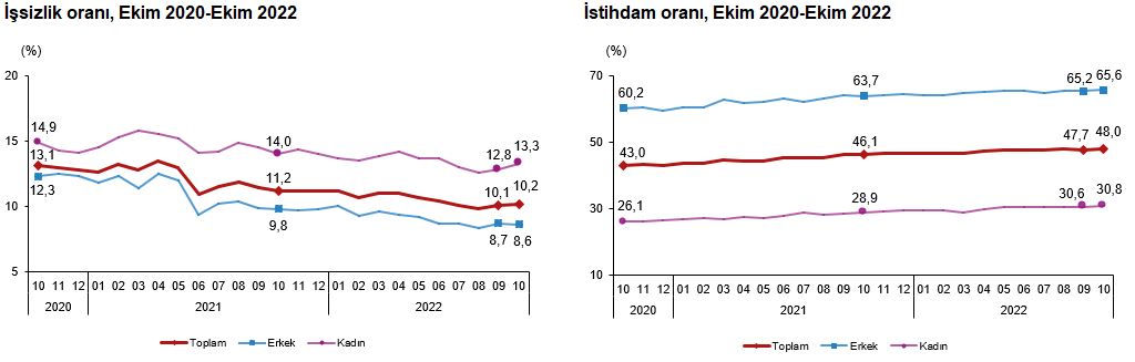 TÜİK, Ekim 2022 iş gücü istatistiklerini açıkladı. Buna göre; 15 ve daha yukarı yaştaki kişilerde işsiz sayısı bir önceki aya göre 57 bin kişi artarak 3 milyon 534 bin kişi oldu. İşsizlik oranı ise 0,1 puanlık artış ile yüzde 10,2 seviyesinde gerçekleşti. İşsizlik oranı erkeklerde yüzde 8,6 iken kadınlarda yüzde 13,3 olarak tahmin edildi. İstihdam edilenlerin sayısı 229 bin kişi artarak 31 milyon 200 bin kişi, istihdam oranı ise 0,3 puanlık artış ile yüzde 48 oldu. Bu oran erkeklerde yüzde 65,6 kadınlarda yüzde 30,8 olarak gerçekleşti.