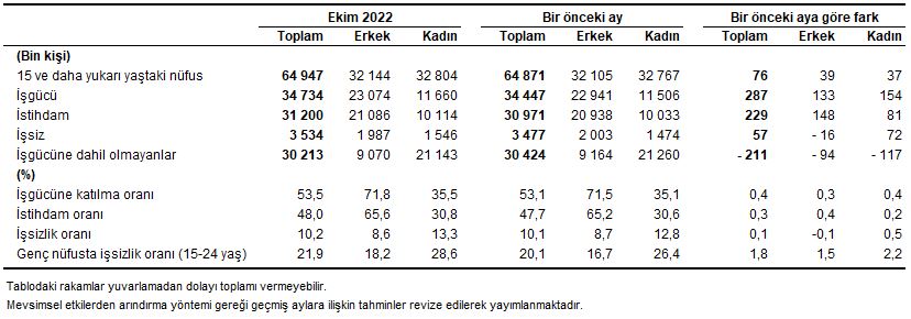 Hanehalkı İşgücü Araştırması sonuçlarına göre; 15 ve daha yukarı yaştaki kişilerde işsiz sayısı 2022 yılı Ekim ayında bir önceki aya göre 57 bin kişi artarak 3 milyon 534 bin kişi oldu. İşsizlik oranı ise 0,1 puanlık artış ile %10,2 seviyesinde gerçekleşti. İşsizlik oranı erkeklerde %8,6 iken kadınlarda %13,3 olarak tahmin edildi.
