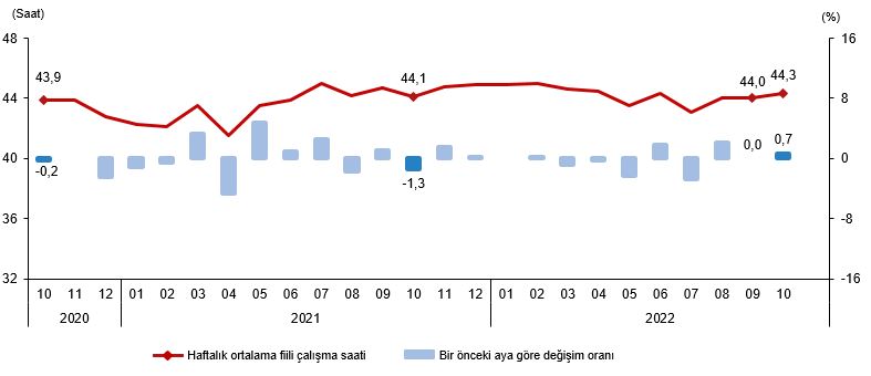 İstihdam edilenlerden referans döneminde işbaşında olanların, mevsim ve takvim etkilerinden arındırılmış haftalık ortalama fiili çalışma süresi 2022 yılı Ekim ayında bir önceki aya göre 0,3 saat artarak 44,3 saat olarak gerçekleşti.