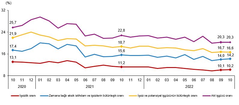Zamana bağlı eksik istihdam, potansiyel işgücü ve işsizlerden oluşan atıl işgücü oranı 2022 yılı Ekim ayında bir önceki aya göre değişim göstermeyerek %20,3 oldu. Zamana bağlı eksik istihdam ve işsizlerin bütünleşik oranı %14,2 iken potansiyel işgücü ve işsizlerin bütünleşik oranı %16,6 olarak tahmin edildi.