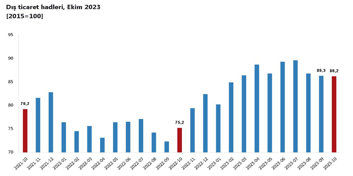 İhracat birim değer endeksinin ithalat birim değer endeksine bölünmesi ile hesaplanan dış ticaret haddi, önceki yılın aynı ayına göre 11 puan artarak 2023 yılı Ekim ayında 86,2 oldu.
