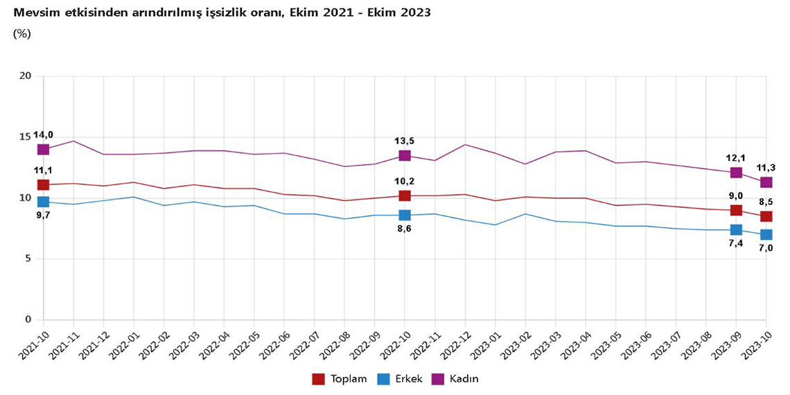 TÜİK, Ekim 2023 dönemine ilişkin işgücü istatistiklerini açıkladı. Buna göre; işsiz sayısı ekim ayında bir önceki aya göre 163 bin kişi azalarak 2 milyon 961 bin kişi oldu. İşsizlik oranı 0,5 puan azalarak yüzde 8,5 seviyesinde gerçekleşti. İşsizlik oranı erkeklerde yüzde 7, kadınlarda yüzde 11,3. İstihdam edilenlerin sayısı, ekim ayında bir önceki aya göre 246 bin kişi artarak 31 milyon 835 bin kişi, istihdam oranı ise 0,3 puan artarak yüze 48,5 oldu. Bu oran erkeklerde yüzde 65,8, kadınlarda yüzde 31,6.