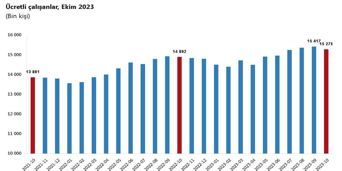 TÜİK, Ekim 2023 dönemine ilişkin ücretli çalışan istatistiklerini açıkladı. Buna göre; sanayi, inşaat ve ticaret-hizmet sektörleri toplamında ücretli çalışan sayısı, ekim ayında bir önceki yılın aynı ayına göre yüzde 2,6 arttı. Ücretli çalışan sayısı bir önceki yılın aynı ayında 14 milyon 891 bin 949 kişiyken, 2023 yılı Ekim ayında 15 milyon 277 bin 929 kişi oldu. Ekim ayında ücretli çalışan sayısı yıllık olarak sanayi sektöründe yüzde 0,6 azaldı, inşaat sektöründe yüzde 12,2 ve ticaret-hizmet sektöründe yüzde 2,7 arttı.