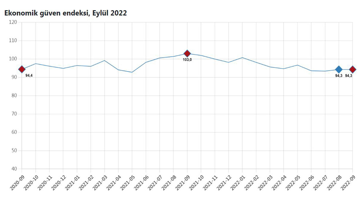 Türkiye İstatistik Kurumu (TÜİK), verilerine göre ekonomik güven endeksi eylül ayında aynı düzeyde kalarak 94,3 değerini aldı.