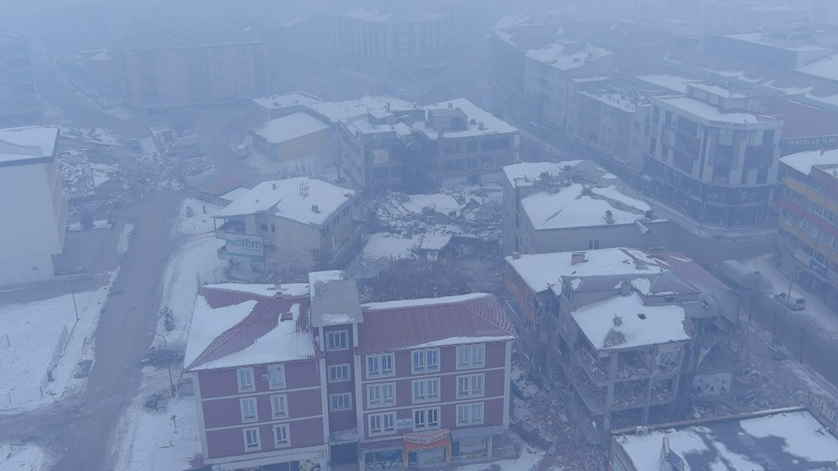 Türkiye’nin 10 ilinde büyük yıkıma yol açan iki büyük depremin ardından Kahramanmaraş Elbistan’daki enkaz havadan görüntülendi. İlçenin birçok yeri ağır hasar alırken, birçok yeri de yıkıldı. Hava sıcaklığının eksi 15 derecelere ulaştığı ilçede, enkazların üstünü de beyaz örtü kapladı.
