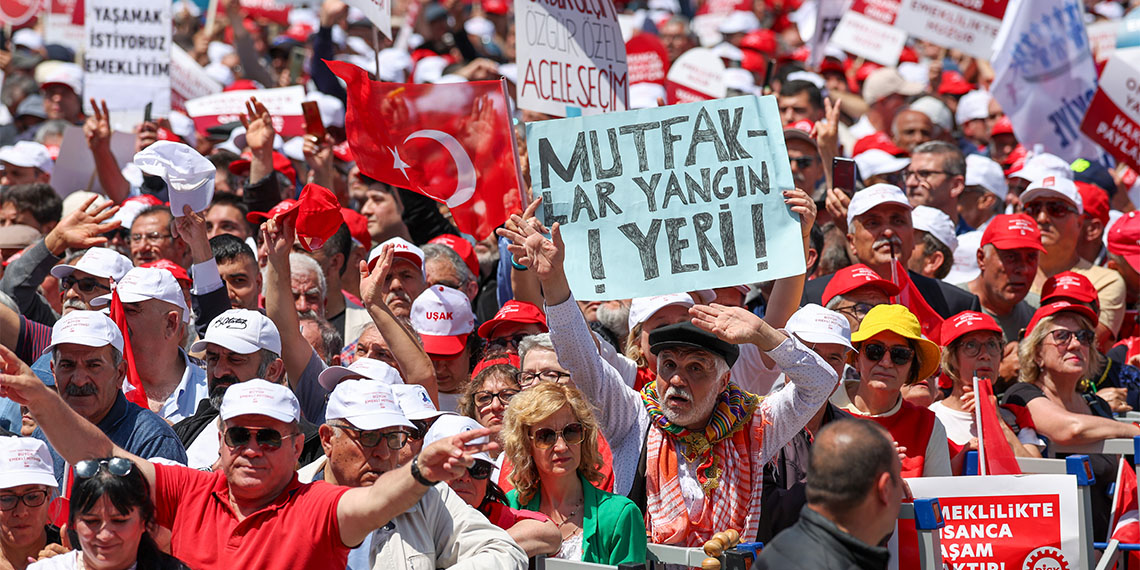 “Emekliler, elinizi kaldırın. Bu eli tutun. Bu eli havada bırakmayın. Emeklimizin elini havada bırakmayın. Biz size el uzatıyoruz. Bu eli havada bırakmayın. CHP olarak geçen seçimlerde emeklilerden en çok oy alan parti olduk. Bunun çok önemli katkısıyla Türkiye’nin birinci partisi olduk. Emeklilere söz veriyorum. Cumhuriyetin ikinci yüzyılının ilk genel seçimlerinde CHP’yi, Gazi Mustafa Kemal Atatürk’ün partisini birinci parti ve iktidar yapacağız. Türkiye ittifakıyla biz bu seçimleri kazanacağız. Türkiye ittifakının içindeki sosyal demokratlar, milliyetçi demokratlar, muhafazakar demokratlar, Kürt demokratlar, Türkiye’nin bütün demokratları önce hükümeti alacağız, sonra size hakkınızı vereceğiz.