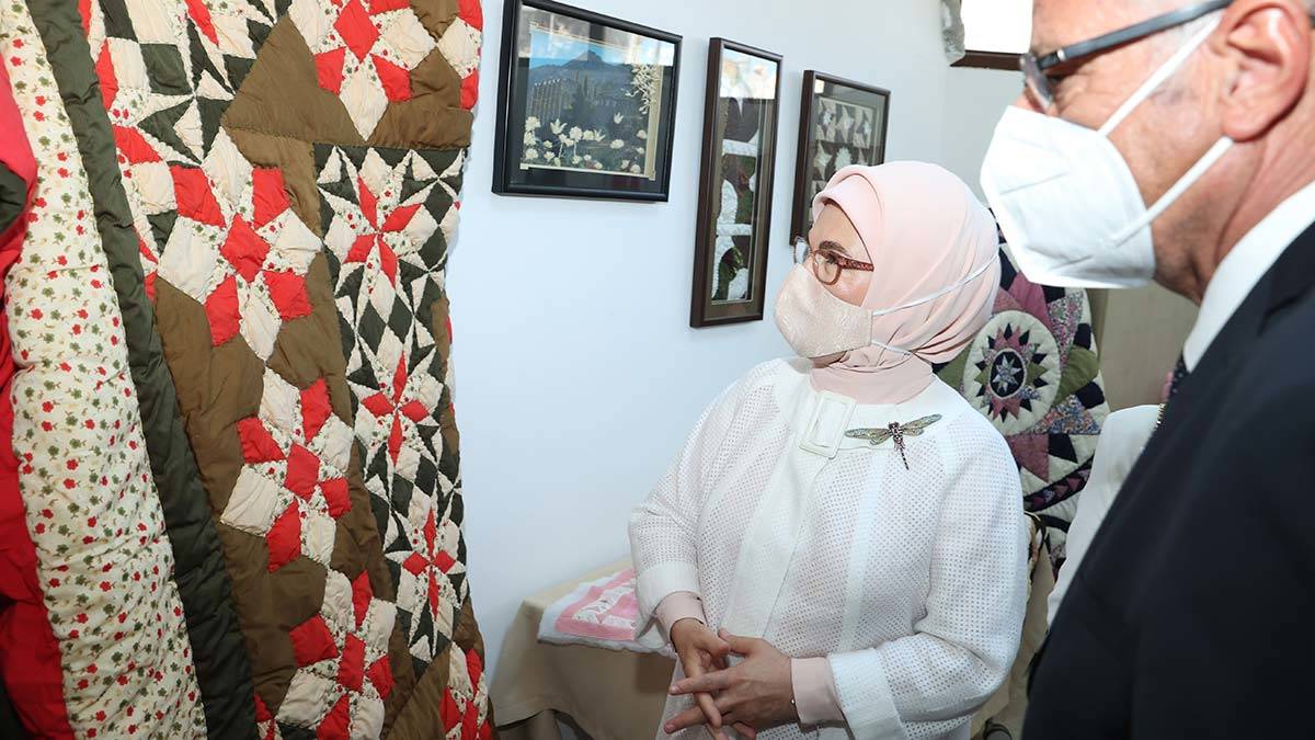 Erdoğan, merkezde Girne Belediyesi Başkanı Nidai Güngördü ile eşi Nurten Güngördü ve Merkezin sorumlusu Misli Kadıoğlu tarafından karşılandı. İlk olarak ipek koza, lapta, lefkara olarak adlandırılan el işleri eğitiminin verildiği odayı ziyaret eden Emine Erdoğan, kursiyerlerin el işi gösterisini izledi.