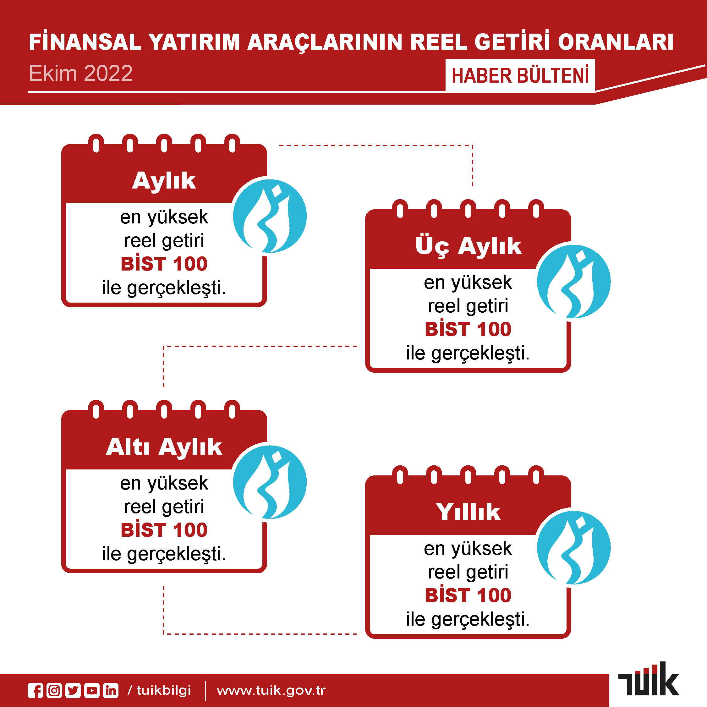TÜİK’ten finansal yatırım araçlarının Ekim 2022’deki reel getiri oranlarına ilişkin açıklamaya göre; aylık en yüksek reel getiri, yurt içi üretici fiyat endeksi (Yİ-ÜFE) ile indirgendiğinde yüzde 4,26, tüketici fiyat endeksi (TÜFE) ile indirgendiğinde ise yüzde 8,58 oranlarıyla BIST 100 endeksinde gerçekleşti.