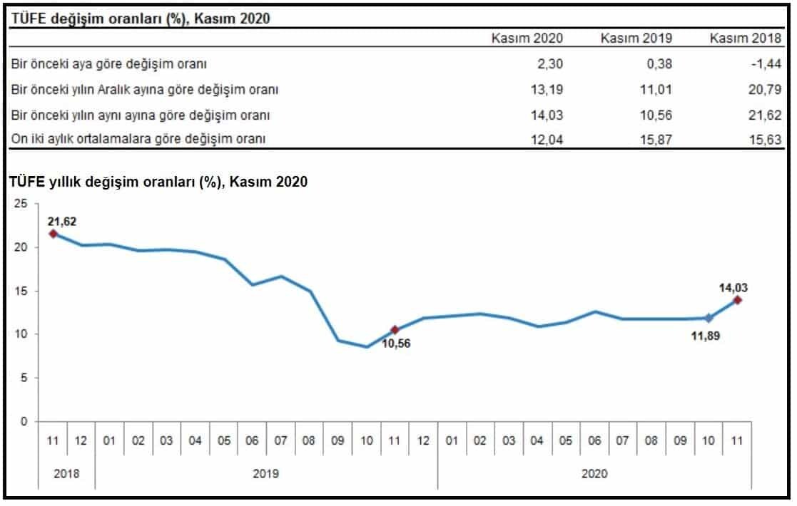 İşlenmemiş gıda ürünleri, enerji, alkollü içkiler ve tütün ile altın hariç TÜFE’de 2020 yılı Kasım ayında bir önceki aya göre yüzde 2.14, bir önceki yılın Aralık ayına göre yüzde 13.26, bir önceki yılın aynı ayına göre yüzde 13.72 ve on iki aylık ortalamalara göre yüzde 11.50 artış gerçekleşti.