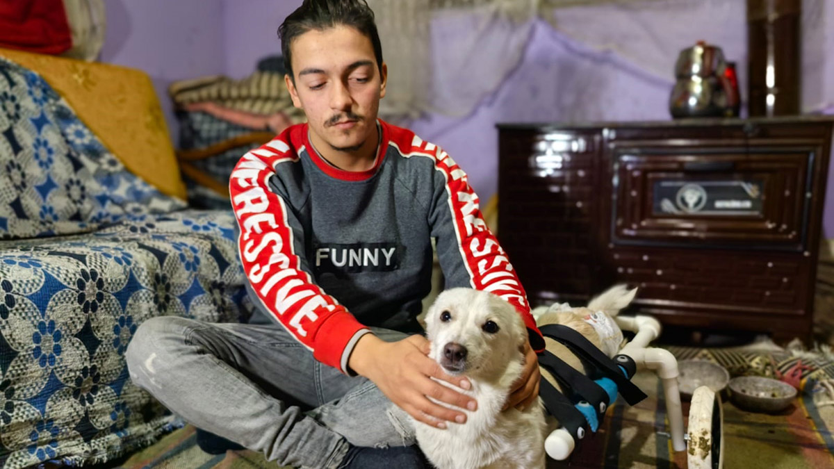 Bursa’nın İnegöl ilçesinde Muharrem Başkurt (20), yolda bulduğu, arka ayakları tutmayan köpeği sahiplendi. Başkurt, su borularıyla yürüteç yaptığı 9 aylık köpeğin yürümesini sağladı.