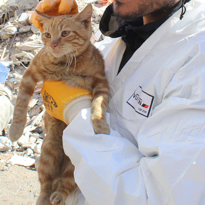 Kahramanmaraş’a arama- kurtarma çalışmalarına destek için gelen gönüllü Batuhan Yusuf Aydın, çöken 3 katlı binada çalıştıkları sırada kedi sesi duydu. Daha sonra ekipler, yerini tespit ettikleri kediyi sıkıştığı enkazdan çıkararak kaldıkları çadıra götürdü. Kediye süt veren Aydın, çadırda bakmaya başladı.