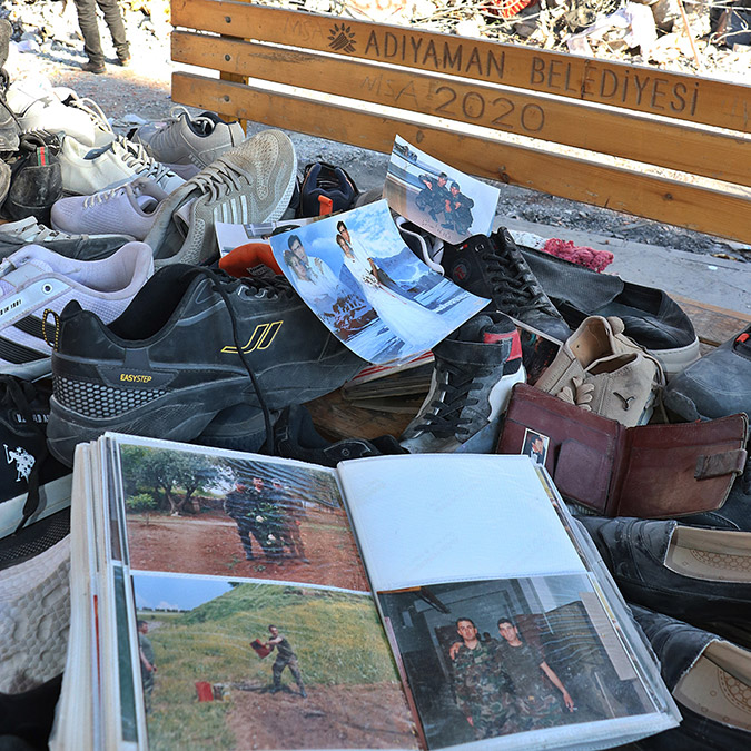 Kahramanmaraş merkezli depremlerde Adıyaman’da da büyük yıkım yaşandı. Binlerce bina ve iş yerinin enkaza döndüğü kentte, kurtarma çalışmaları tamamlanırken, enkaz kaldırma çalışmaları ise devam ediyor. Her biri onlarca kişiye mezar olan Ali Taşı Mahallesi’ndeki Bozbey Apartmanı’nın enkazından çıkarılan fotoğraflar bankın üzerine bırakıldı.