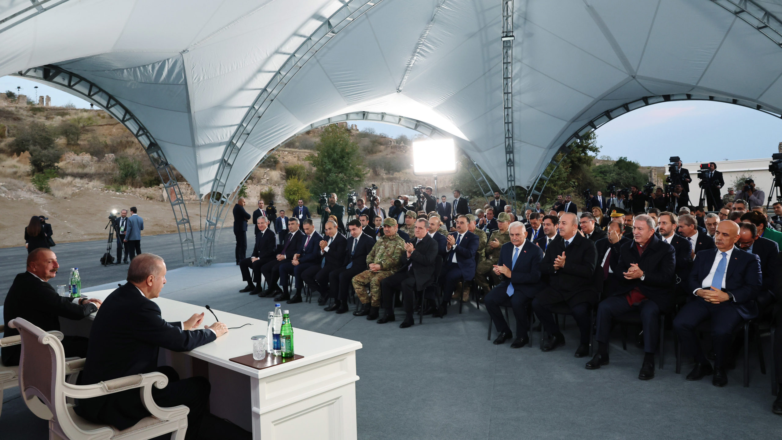 “Eşine az rastlanır bir büyük kalkınma hamlesiyle İlham Aliyev kardeşimin riyasetinde gerçekten tahrip olmuş, yerle yeksan olmuş bu bölgeler yeniden ayağa kalkıyor, yeniden bir Azerbaycan inşa ediliyor.”