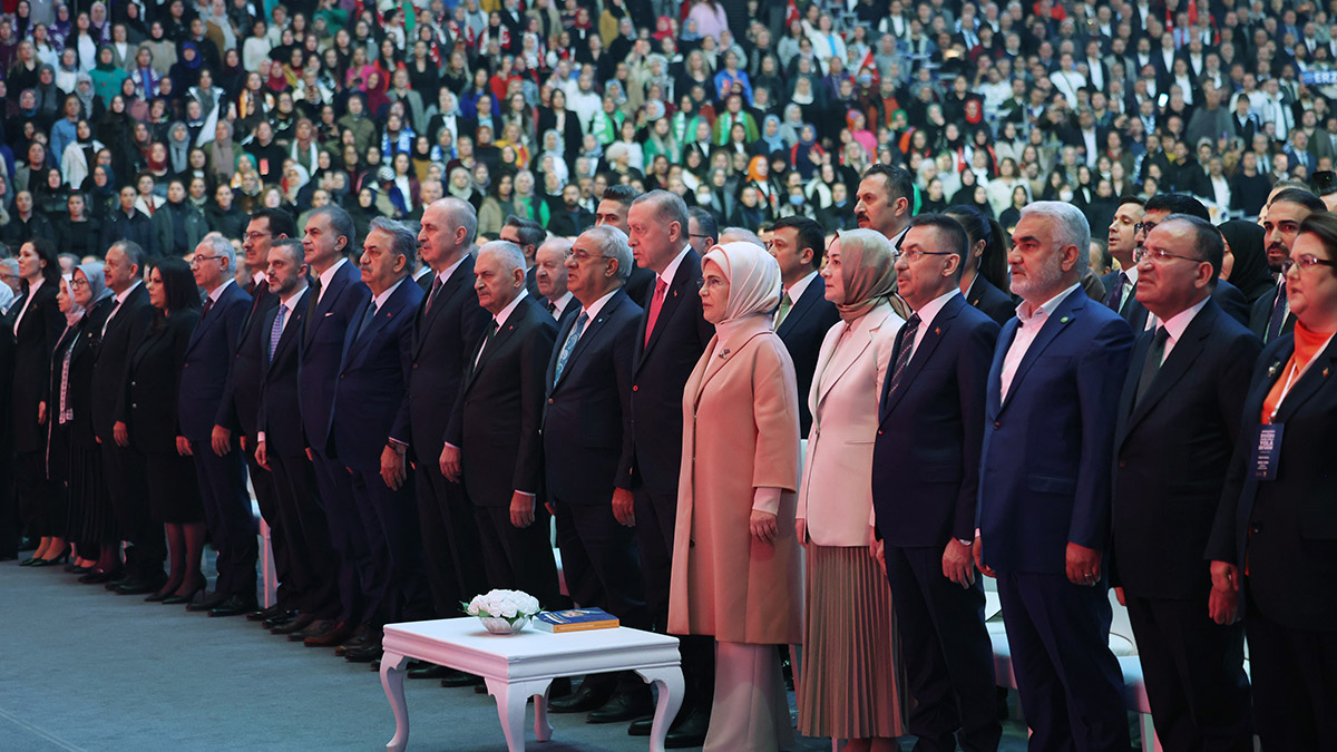 Erdoğan, salona gelişinde dışarıda toplanan kalabalığa otobüsün üzerinden hitap ederek, “Durmak yok yola devam. Gerek ana kademe gerek kadın kolları gerek gençler olarak gümbür gümbür 14 Mayıs’a ilerliyoruz” dedi. Cumhurbaşkanı Erdoğan, eşi Emine Erdoğan ile salona girişinde sloganlarla karşılandı. Saygı duruşunda bulunulması ve İstiklal Marşı’nın okunması ardından ‘AK Parti ve Türkiye Yüzyılı’ içerikli 5 dakikalık tanıtım filmi gösterildi.