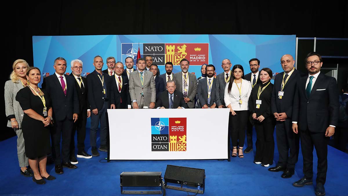 İsveç ve Finlandiya’nın NATO’ya üyelik başvuruları, tabiatıyla zirve bağlamında öne çıkan konulardan birisi oldu. Biz bu noktada en başından beri ortaya koyduğumuz ilkeli ve dirayetli tutumu Madrid’de de sürdürdük. Bu ülkelerin bilhassa terörle mücadele alanında meşru taleplerimize yönelik bağlayıcı taahhütlerde bulunmaları, somut ve net adımlar atmaları gerektiğini kendilerine ifade ettik. Genel Sekreterin kolaylaştırıcılığında gerçekleştirdiğimiz dörtlü zirve akabinde imzalanan muhtırayla tüm bu hususları kayıt altına aldık.