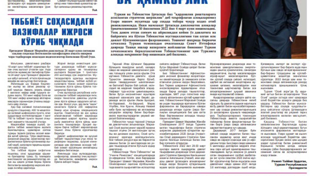 Erdoğan‘ın Yeni Özbekistan gazetesi yazısına, “Türkiye ve Özbekistan arasında bugün ‘kardeşlik hukukuna dayanan stratejik ortaklık’ olarak tanımladığımız ilişkiler, karşılıklı güven ortamında her sahada kök salıyor. İki ülke arasında diplomatik ilişkilerin tesis edilmesinin 30. Yıl dönümünü 4 Mart 2022 tarihinde kutladık. Uzun bir hasretin ardından kendi öz devletine ve bayrağına yeniden kavuşan Özbekistan’ın bağımsızlığını 31 Ağustos 1991 tarihinde tanıyan ilk devlet olmamızla iftihar ediyoruz. Taşkent’teki ilk Büyükelçilik Türkiye tarafından açıldığında, Sovyetler Birliği döneminde Dışişleri Bakanlığı olarak kullanılan binanın Türk Büyükelçiliği’ne tahsis edilmesini, Özbekistan’ın da Türkiye’ye ayrıcalıklı bakışının bir nişanesi olarak görüyoruz.” diyerek başladı.