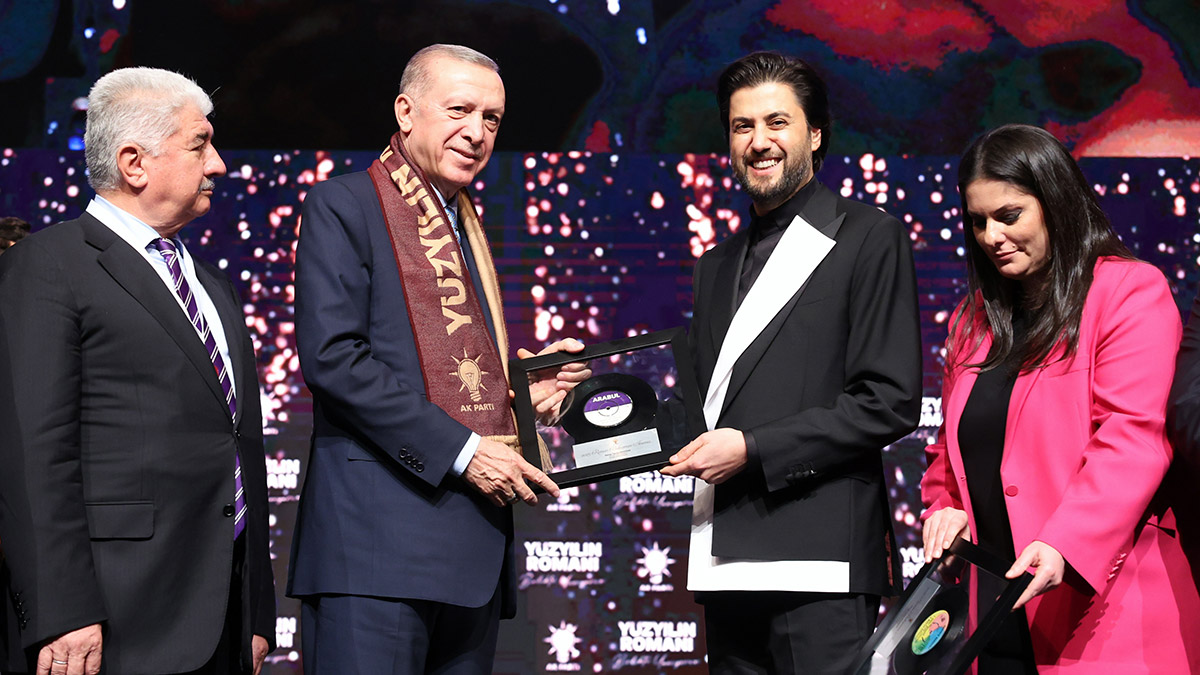 AK Parti Genel Başkan Yardımcısı Jülide Sarıeroğlu, Cumhurbaşkanı Erdoğan’a gramofon takdim etti. Cumhurbaşkanı Erdoğan da sanatçılar Yücel Arzen, Goran Bregovic, Orhan Şallıel ve Muhammed Yıldırır’a da Mustafa Kandıralı’nın taş plaklarını hediye etti.