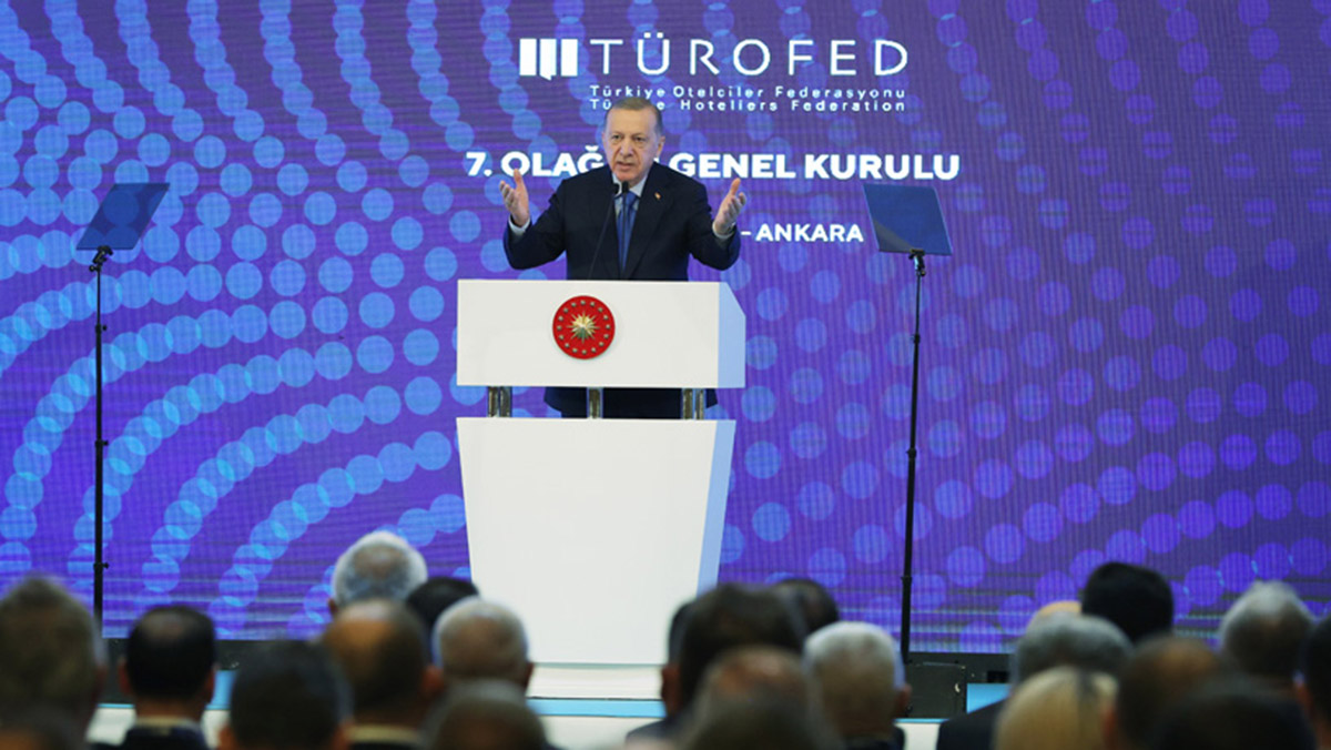 Cumhurbaşkanı Erdoğan, ‘Türkiye Otelciler Federasyonu (TÜROFED) 7’nci Olağan Genel Kurulu’na katıldı. Programda Kültür ve Turizm Bakanı Mehmet Nuri Ersoy, Hazine ve Maliye Bakanı Nureddin Nebati, Ankara Valisi Vasip Şahin, federasyon üyeleri ve sektör temsilcileri de yer aldı.