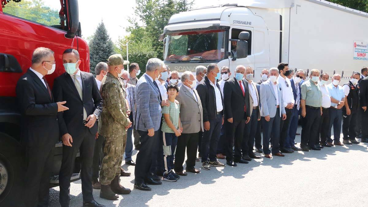 Erzincan Valiliği koordinesinde Erzincan Ticaret ve Sanayi Odası, kamu kurum ve kuruluşları, sivil toplum kuruluşları ve vatandaşların destekleriyle toplanan 5 TIR dolusu yardım, dualar eşliğinde Sinop’a yola çıktı. Valilik binası önünde Erzincan Valisi Mehmet Makas, AK Parti Milletvekili Burhan Çakır, Erzincan Belediye Başkanı Bekir Aksun, Erzincan Ticaret ve Sanayi Odası Başkanı Ahmet Tanoğlu, siyasi parti ve sivil toplum kuruluşu temsilcileri ile kurum amirlerinin katıldığı törende 2 TIR beyaz eşya ve mobilya, 2 TIR muhtelif gıda ve 1 TIR şeker yüklü TIR Sinop’a gönderildi.