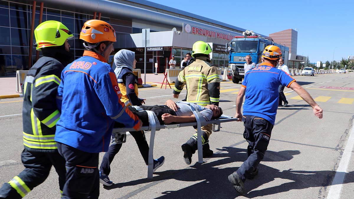Erzurum’da AFAD koordinasyonunda, 2022 Afet Tatbikat yılı kapsamında ‘Tahliye, Yerleştirme ve Planlama Tatbikatı’ gerçekleştirildi. Tatbikat noktalarından biri de Erzurum Havalimanı oldu. Konusu, 7.5 büyüklüğündeki deprem senaryosu olarak belirlenen tatbikat saat 09.30’da başladı. AFAD, Sağlık, Hava Meydan Komutanlığı, İtfaiye ve Devlet Hava Meydanları İşletmesi personelinin katıldığı tatbikat, gerçeğini aratmadı.