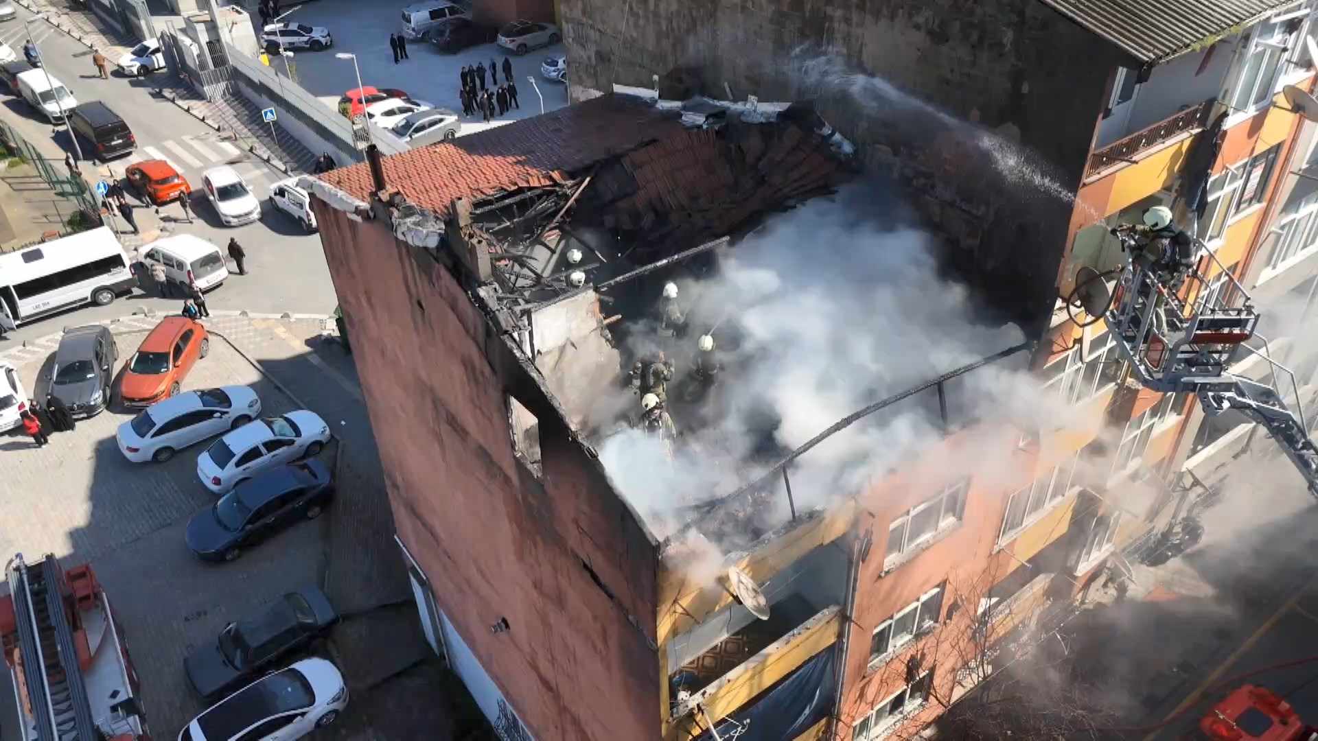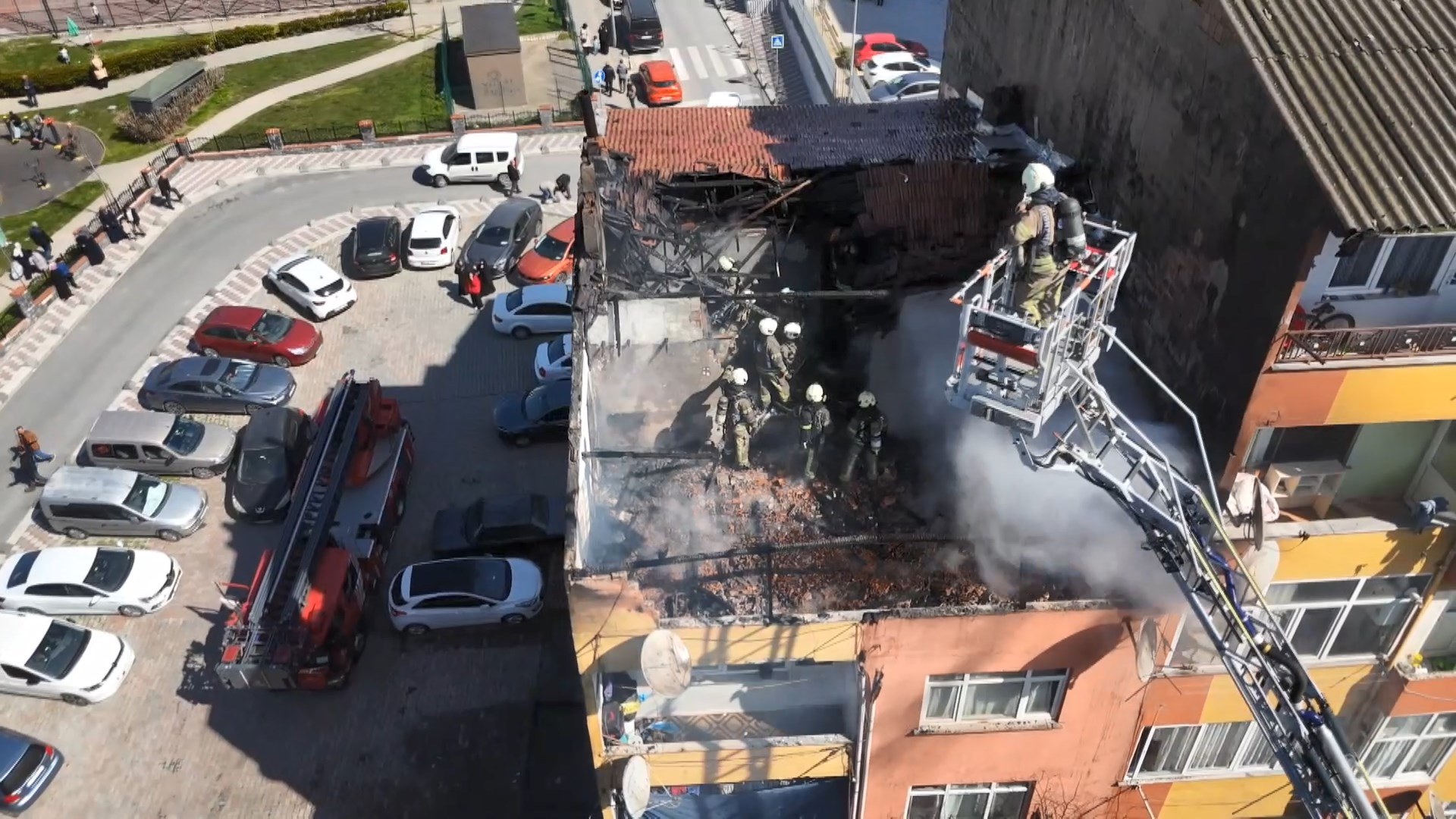 İtfaiye ekiplerinin müdahalesi havadan görüntülenirken çatı katı kullanılamaz hale geldi.