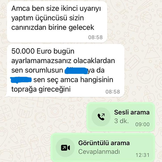 Olay, geçtiğimiz günlerde Bağlarçeşme Mahallesi’nde meydana geldi. İddiaya göre, Ukrayna alan kodlu bir numaradan Z.Y. ile iletişime geçerek kendini ‘Baran’ olarak tanıtan şüpheli, 40 bin euro haraç istedi. Şüpheliler, istedikleri parayı alamayınca, Z.Y.’nin oğluna ve yeğenine araçla işe gittikleri sırada kurşun yağdırdı. Motosikletle olay yerinden kaçan şüpheliler, kısa süre sonra Z.Y. ile tekrar iletişime geçti. Paranın miktarını 50 bin Euro yaptığını söyleyen şüpheli, istediği parayı alamazsa tekrar saldıracağını söyleyerek Z.Y.’yi tehdit etti. Görüşmenin ardından sabah saatlerinde Z.Y. işe gittiği sırada, motosikletli saldırganlar tarafından evi kurşunlandı. Saldırıdan sonra Z.Y. ile telefon üzerinden görüşme gerçekleştiren şüpheli, istediği parayı alamazsa bu sefer 2 çocuğundan birisini öldürmekle tehdit etti.