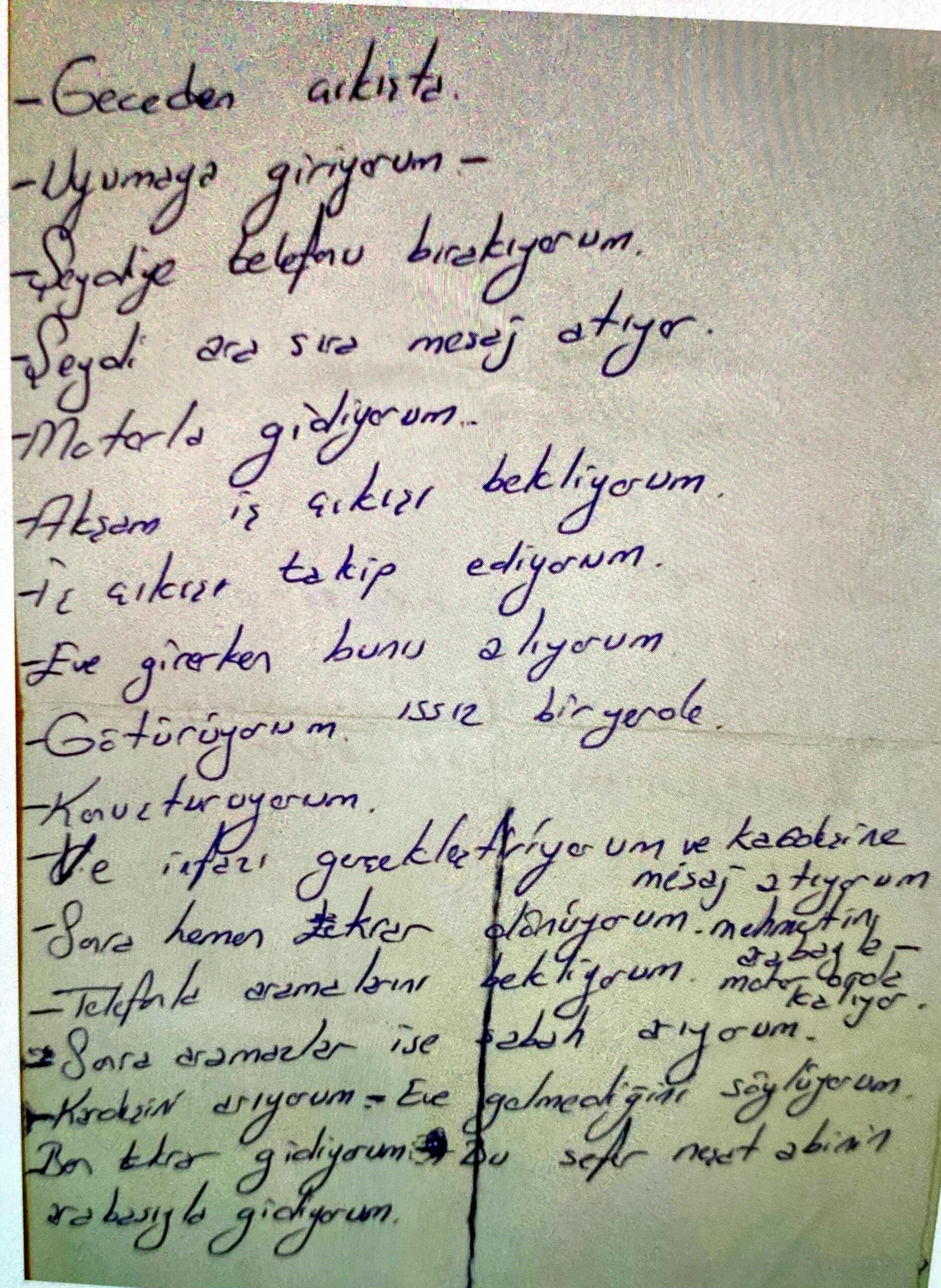 Olayın ardından müştekiler tarafından sanığın cüzdanında bulunan ve eski eşini öldüreceğini yazdığı notta, “Geceden çıkışta uyumaya gidiyorum. Seydi’ye telefonu bırakıyorum. Seydi ara sıra mesaj atıyor. Motorla gidiyorum. Akşam iş çıkışı bekliyorum. İş çıkışı takip ediyorum, eve girerken bunu alıyorum, götürüyorum, ıssız bir yerde konuşturuyorum ve infazı gerçekleştiriyorum” ifadeleri yer aldı.