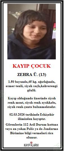Emniyet Genel Müdürlüğü, kayıp Zahra Üzüm’ün bulunması için kentte çok sayıda kişinin cep telefonlarına kısa mesaj göndererek destek istedi. Zehra Üzüm’ün fotoğrafının de yer verildiği mesajda, “Kayıp çocuk, 150 boyunda, 45 kilo ağırlığında, esmer tenli, siyah saçlı, kahverengi gözlü. Kayıp olduğunda üzerinde siyah renk çanta bulunmaktadır. 02.03.2026 Eskişehir ilimizden kayıptır. Görenlerin 112 Acil Durum hattına veya en yakın polis ya da jandarma birimine bilgi vermeleri rica olunur” denildi