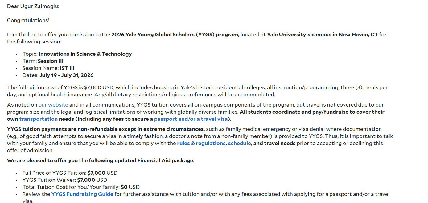 Yale Üniversitesi’ne tam burslu kabul edildiği için mutlu ve gururlu olduğunu kaydeden Zaimoğlu, “Sonuçlar çok erken açıklanmıştı. Büyük ihtimalle ‘ret’ diye bekliyordum ben aslında ama girdiğimde bir baktım ki kabul almışım. Hem de tam bursu olarak. Gerçekten de çok heyecanlanmıştım. Şu an Türkiye’den katılımcı sayısını tam olarak söyleyemiyorum çünkü bunu açıklamadılar ama benim bildiğim kadarıyla şu an 3 katılımcı var bu sene. İlk önce bu programda tabii 150 farklı ülkeden herkesin değişik bir görüş açısı olacak ve düşünceleri ve hikayeleri olacak. Bu hikayelerin hepsini alıp özellikle de profesörlerden ve endüstri liderlerinden derslerimi aldıktan sonra bu bilgilerin hepsini Türkiye’ye geri katmak ve buradaki öğrencilere de ayrı şekilde motivasyon vermek istiyorum. Üniversitede mühendislik seçeceğim o kesin ama hangi dal olduğunu şimdilik belirleyemedim. Materyal mühendisliği üzerinde olabilir diye düşünüyorum. Ya da elektrik elektronik mühendisliği. Üniversite hayallerim için ise 8 elit araştırma üniversitesi anlamına gelen ‘Ivy League’ üniversiteleri ya da Cambridge Üniversitesi’ni düşünüyorum” diye konuştu.