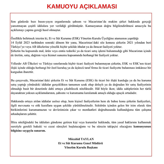 Öte yandan, konuyla ilgili açıklama yapan ESK Genel Müdürü ve Yönetim Kurulu Başkanı Mücahid Taylan, basın-yayın organlarında yer alan, kendisi ve Macaristan’da faaliyet gösterdiği iddia edilen bir şirketle ilgili ortaya atılan iddiaların gerçeği yansıtmadığını ifade etti. Taylan, “Son günlerde bazı basın-yayın organlarında şahsım ve Macaristan’da mukim şirket hakkında gerçeği yansıtmayan çeşitli iddialara yer verildiği görülmüştür. Kamuoyunun doğru bilgilendirilmesi amacıyla bu açıklamayı yapma gereği hasıl olmuştur. Özellikle belirtmek isterim ki Et ve Süt Kurumu (ESK) Yönetim Kurulu Üyeliğine atamamın yapıldığı 14 Eylül 2023 tarihinden sonraki dönem bir yana, Macaristan’daki söz konusu şirketin 2021 yılından beri Türkiye’ye veya AB ülkelerine yönelik hiçbir şekilde ithalat ya da ihracat faaliyeti yoktur. Şirketin bu kapsamda mal, ürün veya emtia tedariki ya da ticari satış işlemi bulunmadığı gibi Macaristan içinde de üretim, satış, dağıtım veya hizmet sunumu kapsamında herhangi bir faaliyeti yoktur. Yıllardır AB ülkeleri ve Türkiye sınırlarında hiçbir ticari faaliyeti bulunmayan şirketin, ESK ve ESK’nin ticari ilişki içinde olduğu herhangi bir özel kuruluş ya da üçüncü taraf firma ile ticari faaliyette bulunması imkansız bir kurgudan ibarettir” dedi.