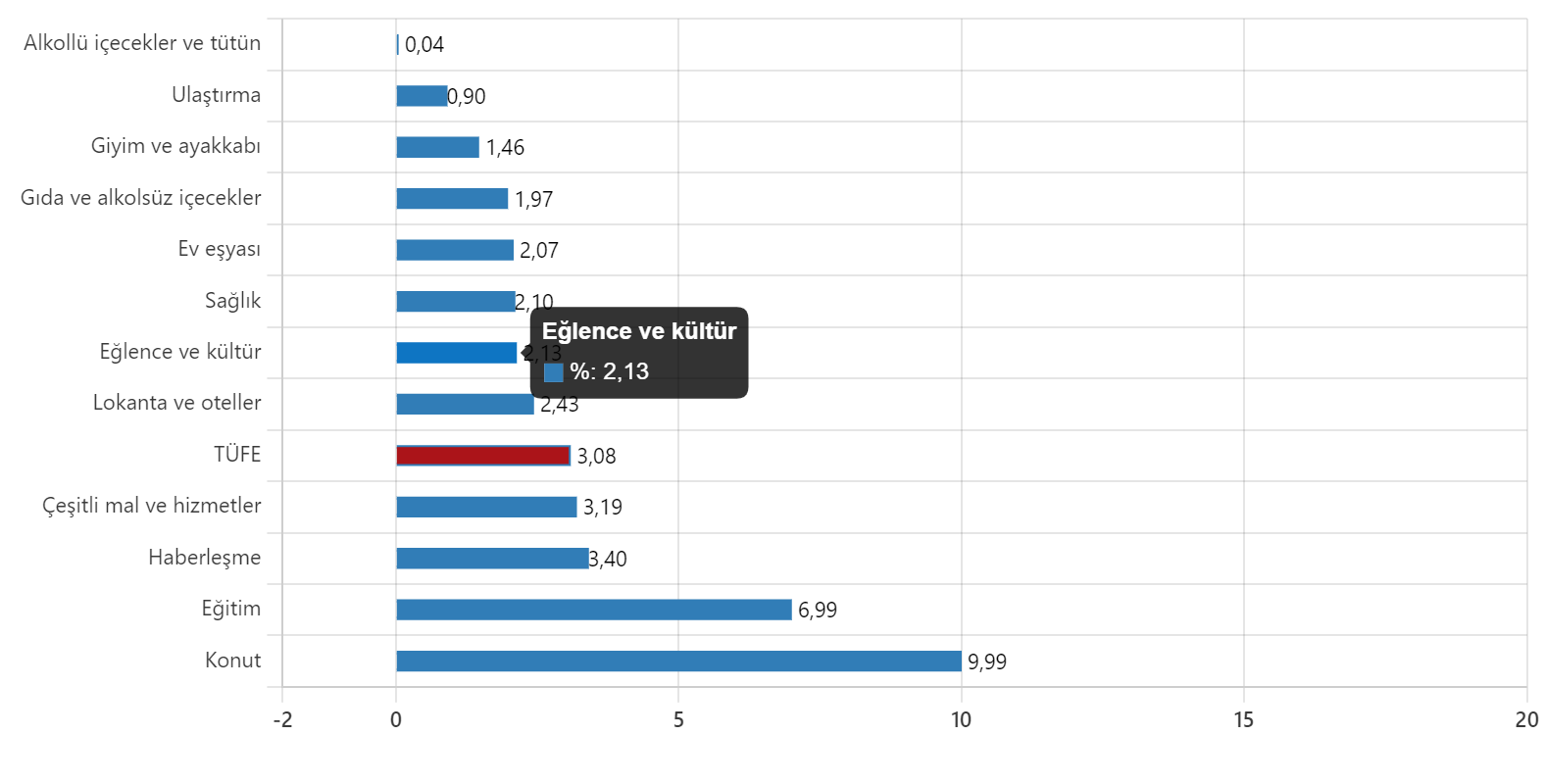 Bir önceki yılın aynı ayına göre en az artış gösteren ana grup %30,76 ile haberleşme oldu. Buna karşılık, bir önceki yılın aynı ayına göre artışın en yüksek olduğu ana grup ise %117,66 ile ulaştırma oldu.