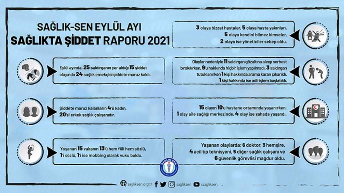 Sağlık-Sen tarafından yapılan yazılı açıklamada, Türkiye’de okulların açılmasıyla birlikte koronavirüs vaka sayılarının artışa geçtiği eylül ayında sağlık çalışanlarının iş yükünün de arttığı belirtildi. Eylül ayında sağlık çalışanlarının 15 şiddet vakası yaşadığı, bu vakalarda rol alan 25 saldırganın, 24 sağlık çalışanının mağdur olmasına neden olduğu kaydedildi.
