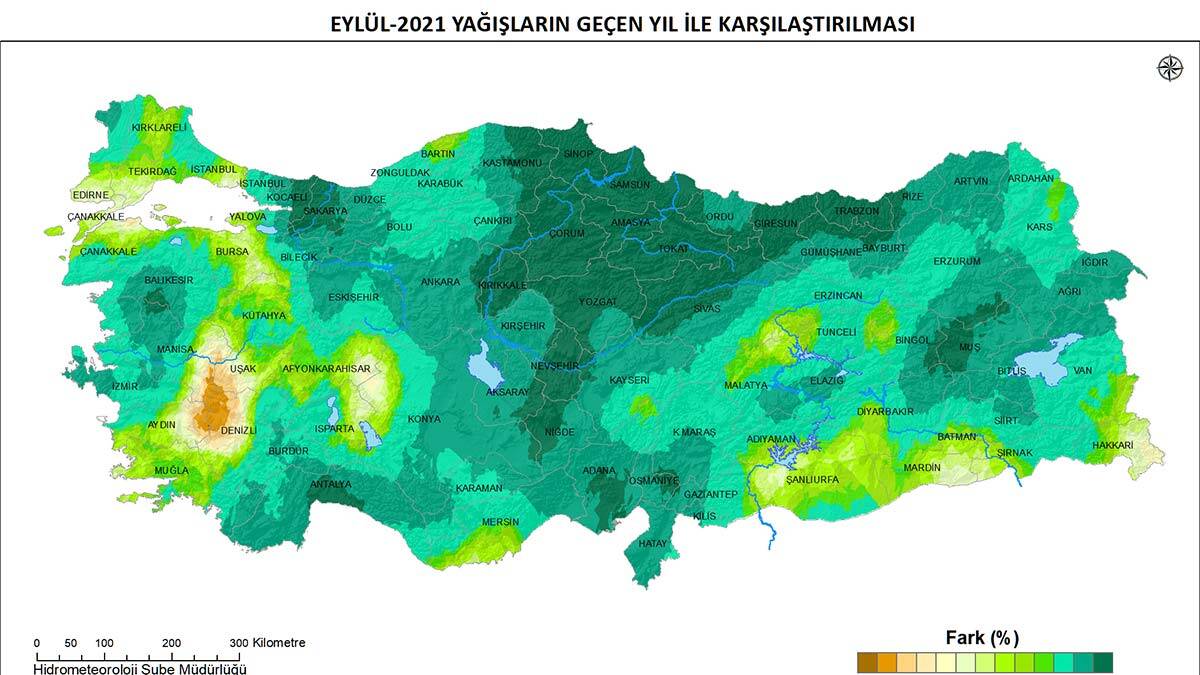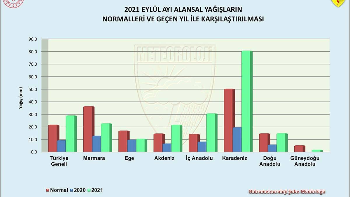Meteoroloji Genel Müdürlüğü’nün ‘2021 Yılı Eylül Ayı Alansal Yağış Raporu’ yayımlandı. Türkiye geneli eylül ayı yağışları, geçen yıl yağışlarının üzerinde gerçekleşti. Eylül ayı yağışı 29,4 mm, normali (1981- 2010) 21,8 mm ve 2020 yılı eylül ayı yağışı 9,4 mm olarak açıklandı. Yağışlarda normale göre yüzde 35, geçen yıl eylül ayı yağışlarına göre yüzde 313’e yakın artış yaşandı.