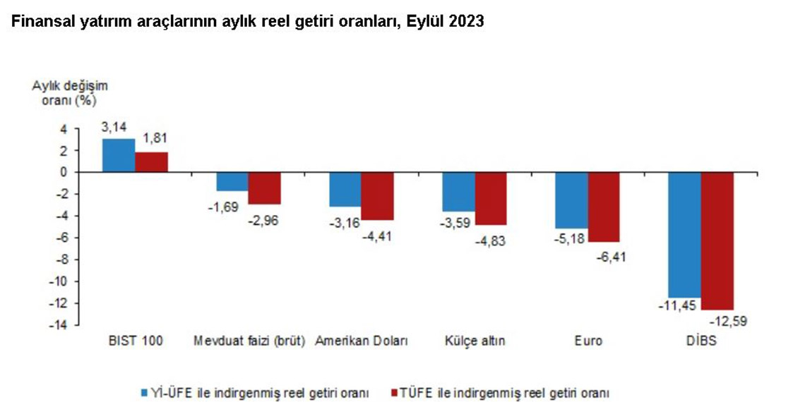 Türkiye İstatistik Kurumu (TÜİK), eylülde en yüksek reel getiri sağlayan yatırım aracının BİST 100 endeksi olduğunu duyurdu.
